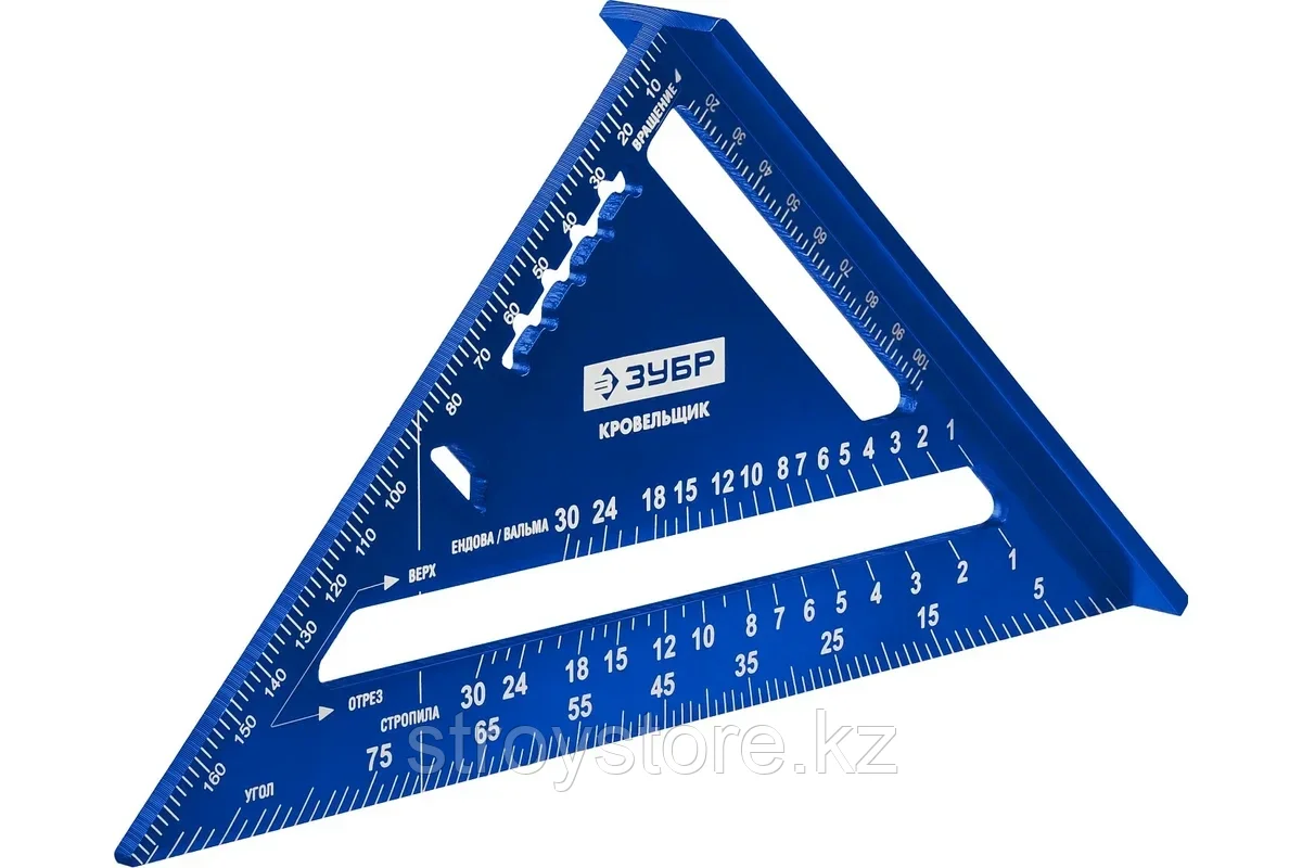 Универсальный кровельный угольник ЗУБР Кровельщик 180 мм, 5-в-1 34391-18 представляет собой инструмент для точного определения расстояния в диапазоне от 0 до 180 мм. Может применяться в качестве угольника, торцовочного угольника, транспортира, рейсмуса и направляющей для пилы.